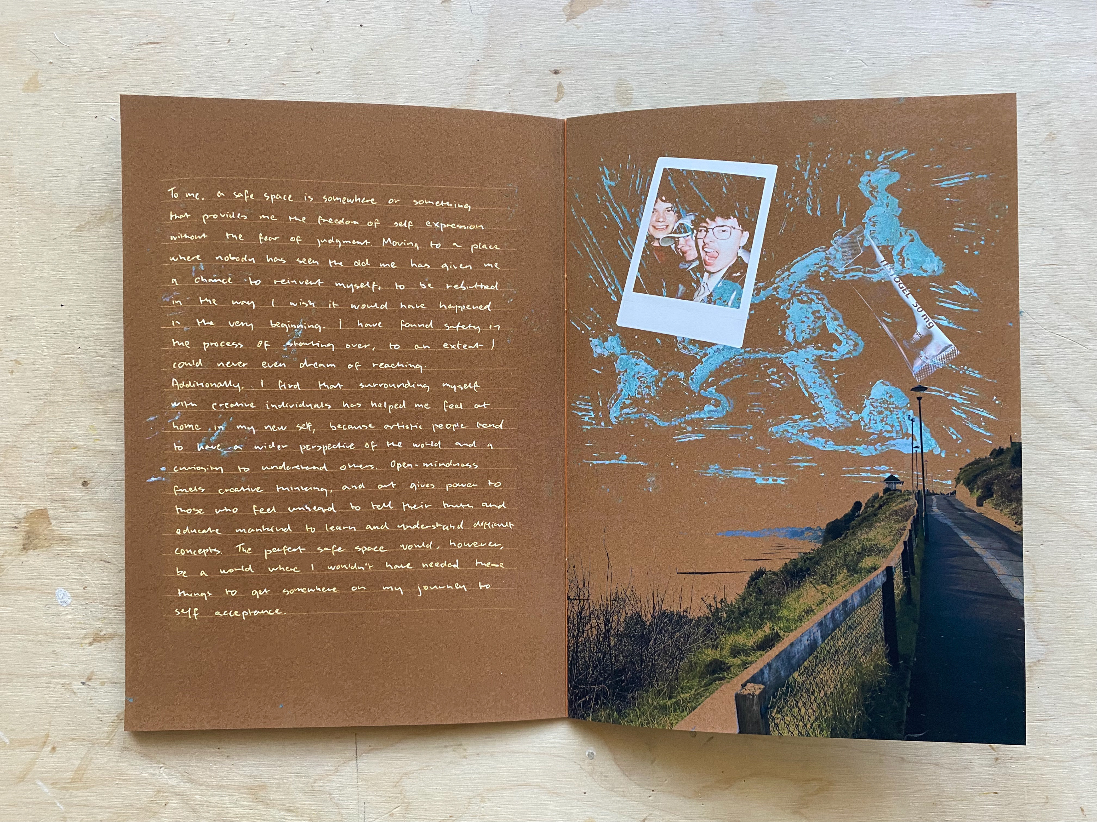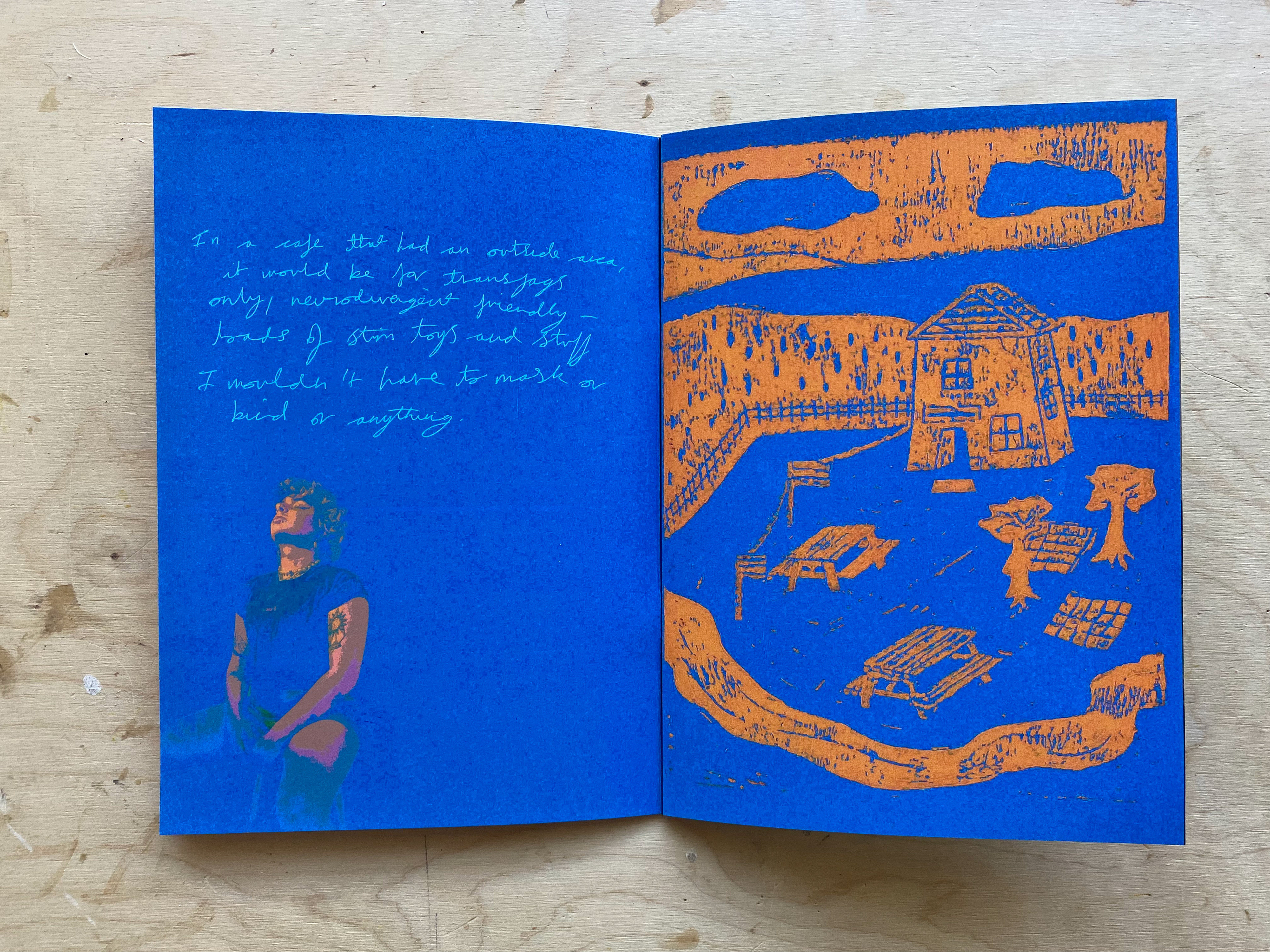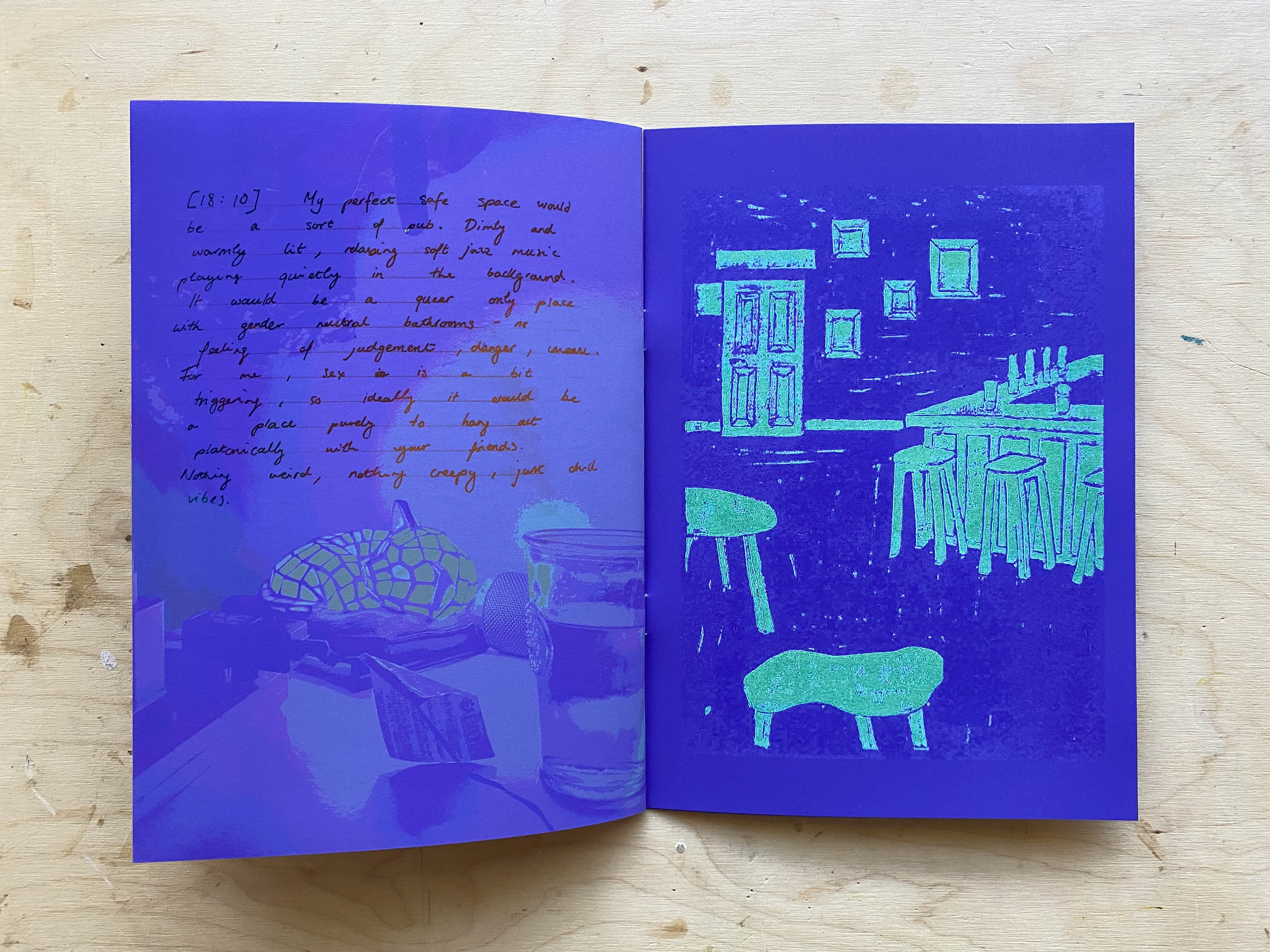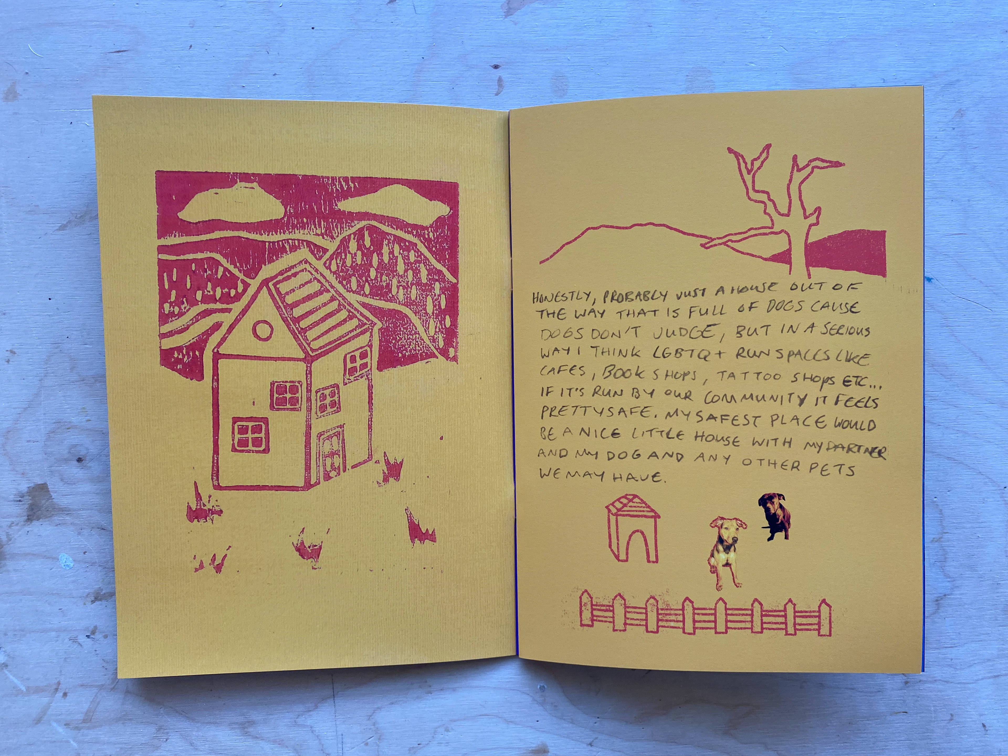 a zine with words from eight trans people, responding to the question "if you could create your perfect safe space, what would it be?"